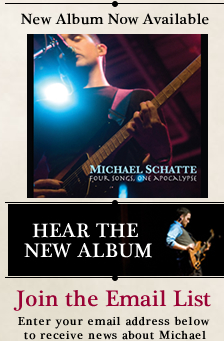 Michael's new E.P. entitled Four Songs, One Apocalypse, is currently in production and will be available for sale starting July 28th, 2012 with the E.P. Release Concert and Live Recording/Filming Session taking place that evening at Aeolian Hall, in London, Ontario (see above). The E.P. features four new original songs plus a live bonus cut. Check back here for online purchasing details...