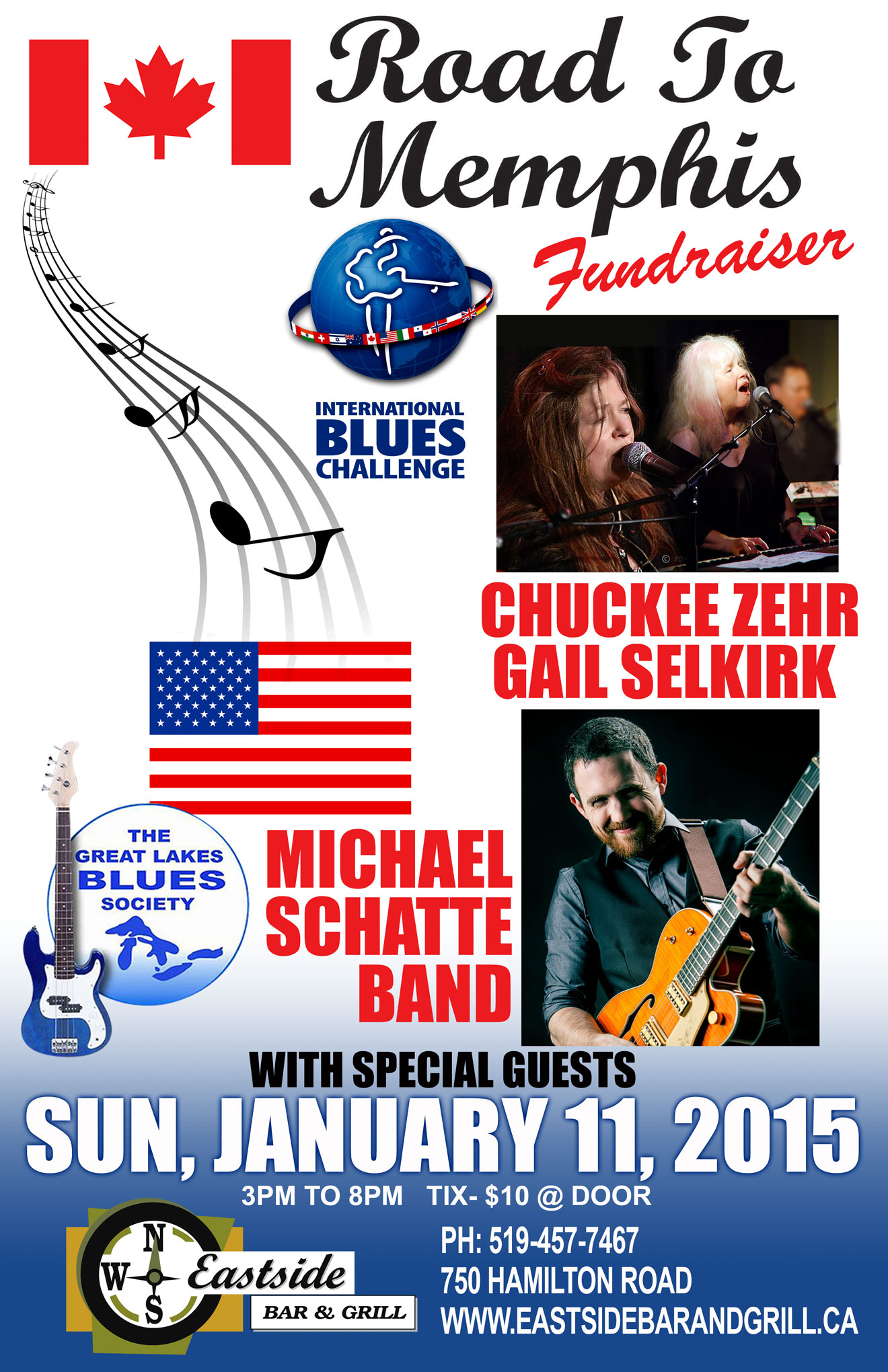 The Michael Schatte Band will perform at the Eastside Bar and Grill in London, ON on Sunday, January 11th to raise funds toward their trip to Memphis later in the month. Also performing are The Katfight Keys (Chuckee Zehr and Gail Selkirk) who will be competing in Memphis in the duo category, as well as some special guests. Click the poster below for more info: