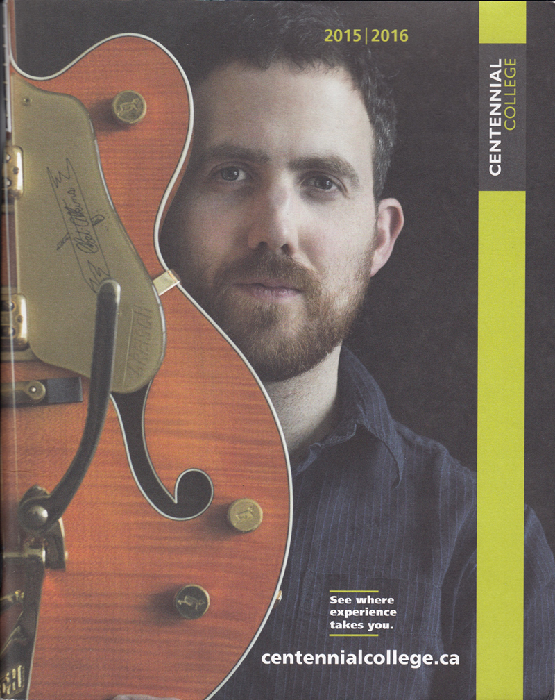 Centennial College: Michael is on the cover of the Toronto college's 2015-2016 school program. A part-time guitar instructor in Centennial's excellent and blossoming Music Industry Arts and Performance program, Michael was surprised and delighted to see his image (and more importantly, that of his beloved Gretsch 6120 guitar!) used for the entire College's primary promotional publication. Click the image below to enlarge: